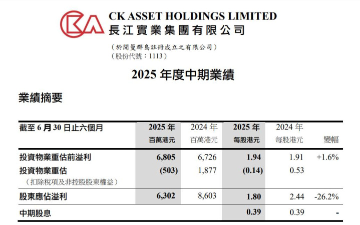 近日,长实集团公布了2025年中期业绩。财报显示,今年上半年,该公司收入约253.86亿港元,同比增长15.3%;受投资物业估值大幅缩减影响,股东应占净利润约63.02亿港元,同比减少26.2%。投资物业重估前,净利润约68.05亿港元,同比增长1.17%。